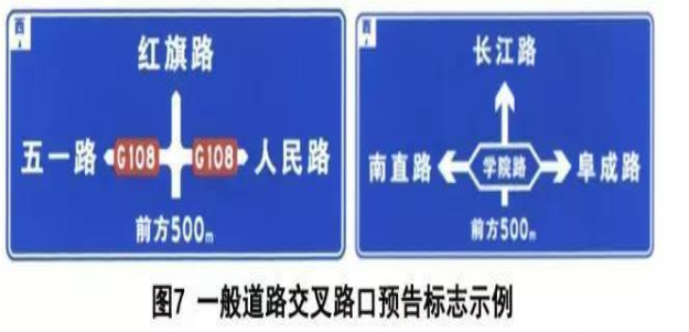 一般道路交叉路口預告標志主要用于公路,城市道路由于道路網密度大、交叉口間距短的特點,很少設置此預告標志。