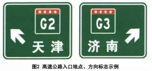 入口指引標志:包括入口預告標志,入口處地點、方向標志,命名編號標志,路名標志;