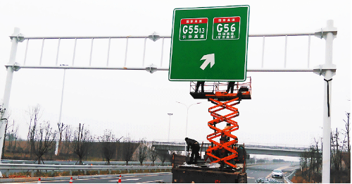 4) 高速公路、城市快速路上的門架標志和懸臂標志,為獲得與路側標志相當的反光效果,宜選用比路側標志所用反光膜等級為高的反光材料,或把門架標志和懸臂標志上的字符改用反射器,以改善其夜間視認性。在有條件的重要路段,也可采用照明標志。