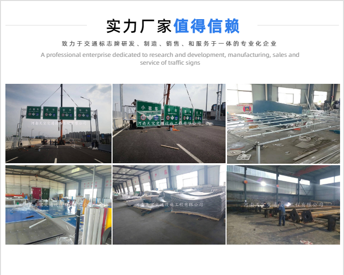 立足中原,展望全國。主要生產交通標志桿、龍門架、交通標志牌,交通信號桿、交通控桿(交通攝像桿)、并可根據客戶要求制作各種戶外大型廣告牌,本公司近年來與多家大型實力雄厚的交通設施企業建立了長期合作關系,憑借產品質量過硬,按工期準時交貨,保證了高速公路、省級公路按時通車,獲得客戶的一致認可和好評。